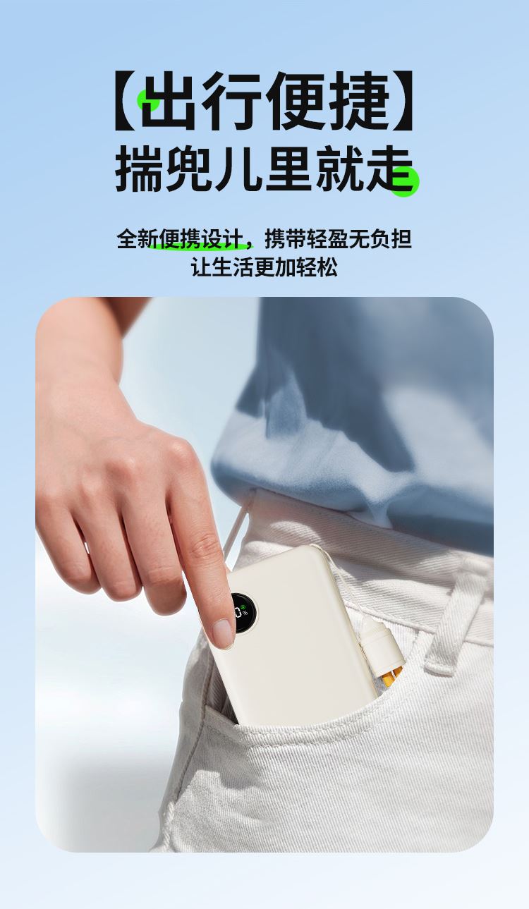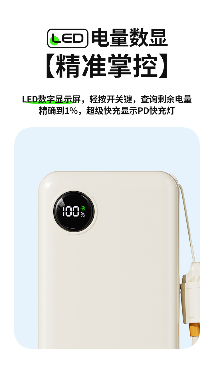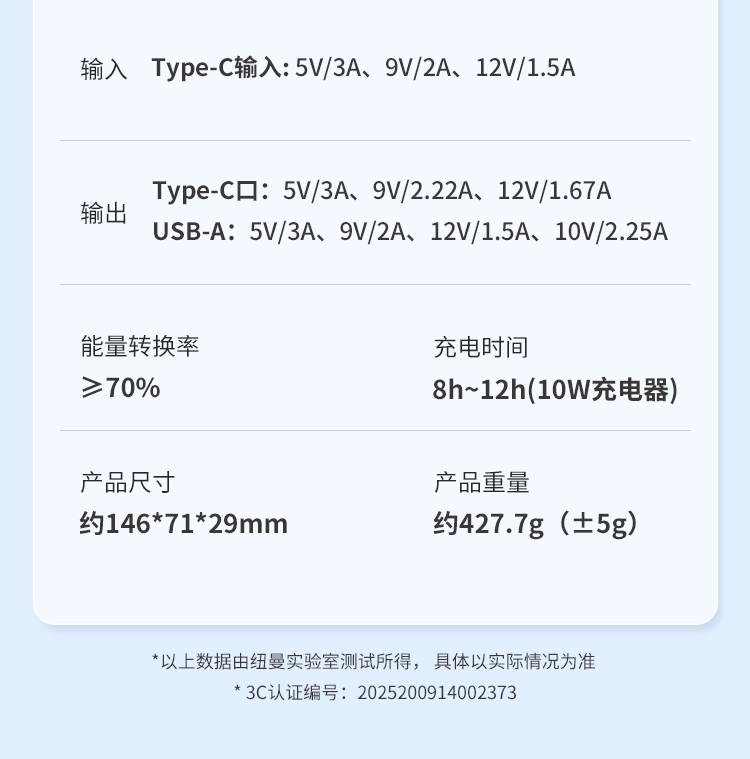 2万毫安,自带Type-c快充挂绳线,数显电量。22.5W快充:电池类型:聚合物锂离子电池电池容量:20000mAh,额定容量:10600mAh输л腆荟浼坟围:Type-C口:5V=3A 9V-2A 12V=1.5A输出:Type-C口:5V-3A,9V-2.22A、12V=1.67AUSB-A口:5V=3A、9V=2A、12V-1.5A、10V=2.25A,产品尺寸:146*71*29mm